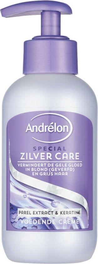 Die Andrélon Zilver Care Pflegecreme hat einen blau-violetten Farbstoff, der den Gelbstich in (gefärbtem) blondem, grauem Haar neutralisiert und das Haar besonders intensiv pflegt.