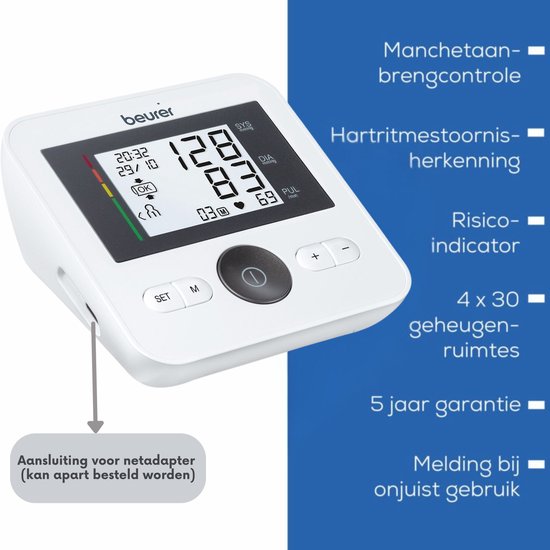 Beurer BM 27+ Oberarm-Blutdruckmessgerät – Netzbetrieb & Batterie – Empfohlen von der Herzstiftung – Unregelmäßiger Herzschlag – Risikoindikator – Manschetten-Anlegekontrolle – Manschette 22-42 cm