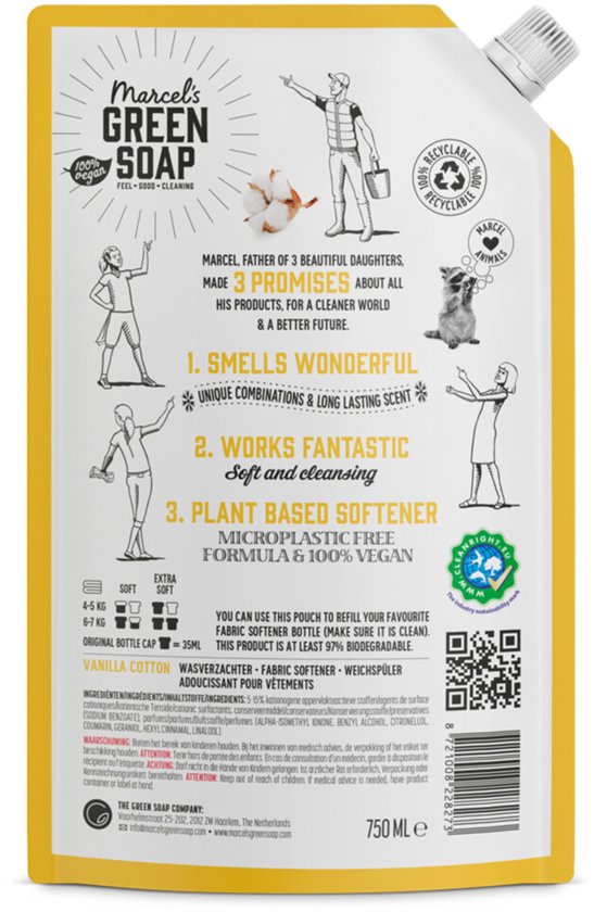 Marcel's Green Soap Weichspüler Baumwolle & Vanille Nachfüller Marcel's Green Soap Weichspüler Baumwolle & Vanille Nachfüller hinterlässt einen wunderbaren Duft auf Ihrer Kleidung und Bettwäsche. Der sanfte Duft von Baumwolle und Vanille hält lange an, während sich Ihre Wäsche weicher anfühlt. Mit diesem günstigen Nachfüller sparen Sie satte 62 % Plastik im Vergleich zur Originalflasche. Es ist eine umweltfreundliche Wahl, die zu einem nachhaltigeren Haushalt beiträgt. Der Nachfüller ist einfach zu verwenden und bietet die perfekte Lösung für alle, die Geld sparen und gleichzeitig ihre Wäsche mit einem angenehmen Duft verwöhnen möchten. * Herrlicher Duft von Baumwolle und Vanille * Sparen Sie mit dem Nachfüller 62 % Plastik * Umweltfreundlich und günstig