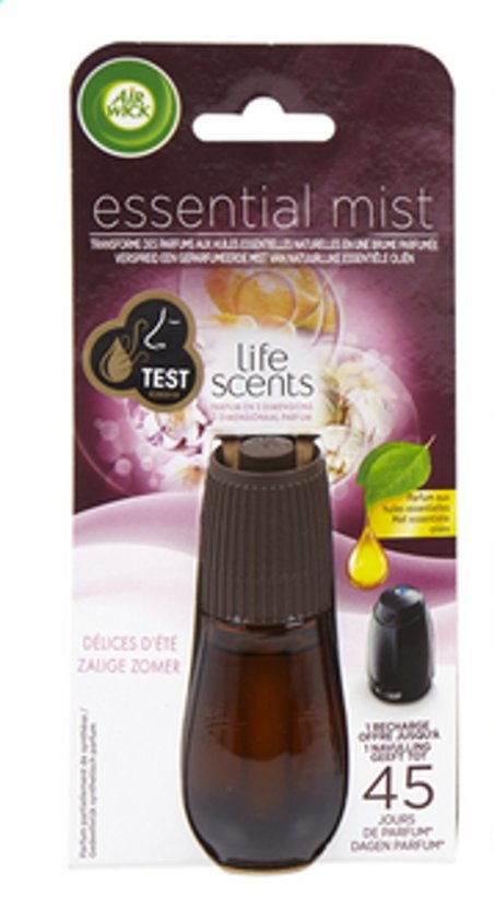 The Air Wick Essential Mist air freshener diffuses a perfumed mist of natural essential oils. The perfumed mist is diffused at regular intervals, depending on the frequency you choose.