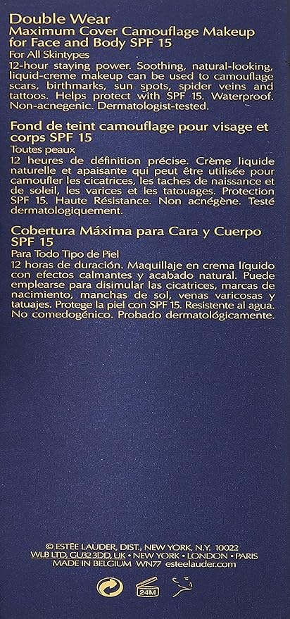 Een verzachtende, vloeibare crème make-up voor gezicht en lichaam. Helpt bij het camoufleren van alle huidimperfecties, waaronder chirurgische littekens, acnelittekens, moedervlekken, zonnevlekken en spataderen. Biedt een 12 uur lang houdbare, niet-afgevende formule. Beschermt de huid tegen schadelijke UV-stralen met SPF 15. Geeft volledige dekking en een natuurlijk ogende finish.