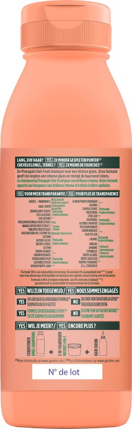 Long and dull hair? Choose Garnier's Fructis Hair Food Pineapple shampoo. The first vegan* shampoo from Fructis with pineapple extract is 96% naturally derived: the light mousse gently cleanses and nourishes without weighing hair down. For shiny long hair. For the best result? Then go for the complete Pineapple routine for long and dull hair by also choosing the Pineapple conditioner and the Pineapple 3-in-1 hair mask from Fructis Hair Food. + The new lamellar care Hair Drink Pineapple. YES - Formula with 96% naturally derived YES - Vegan* YES - Cruelty Free International certified