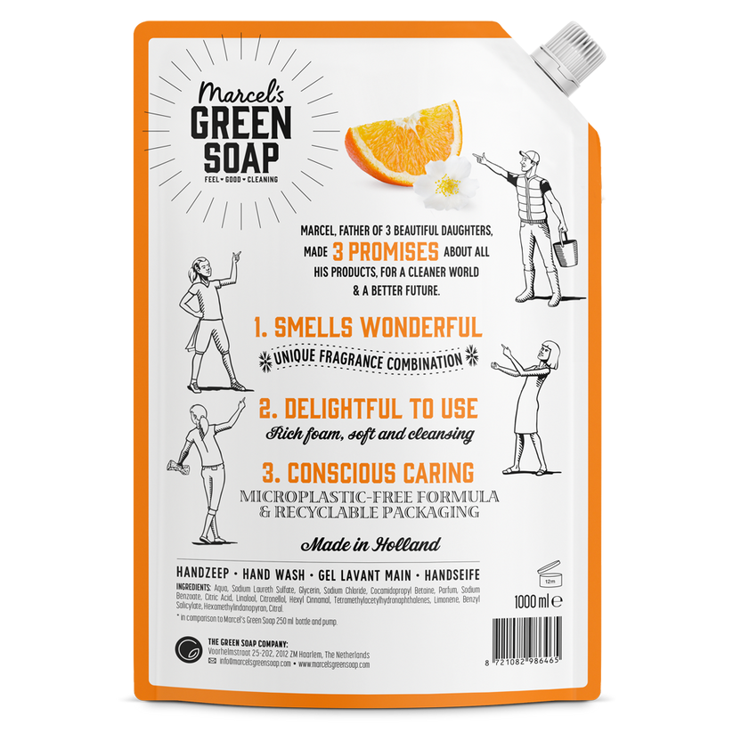 Deze Marcel’s Green Soap Handzeep Patchouli & Cranberry navulling is een heerlijk geurende handzeep en is geschikt om de handzeepflessen na te vullen. Deze zeep is gemaakt van plantaardige zepen en verrijkt met essentiële olie van Patchouli & Cranberry. De handzeep bevat extra glycerine om je handen een zacht en prettig gevoel te geven. Deze Patchouli & Cranberry handzeep bevat geen kleurstoffen, parabenen, fosfaten, chloor, ammonia of zuren. Het is voor 97% biologisch afbreekbaar en is vol met natuurlijke ingrediënten.