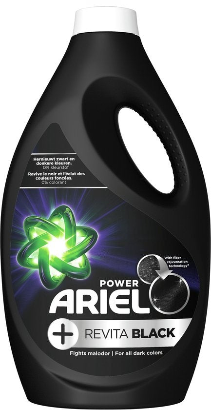 Ariel +Revitablack Vloeibaar Wasmiddel vernieuwt zwarttinten en laat donkere kleuren glanzen met vezelverjongingstechnologie.