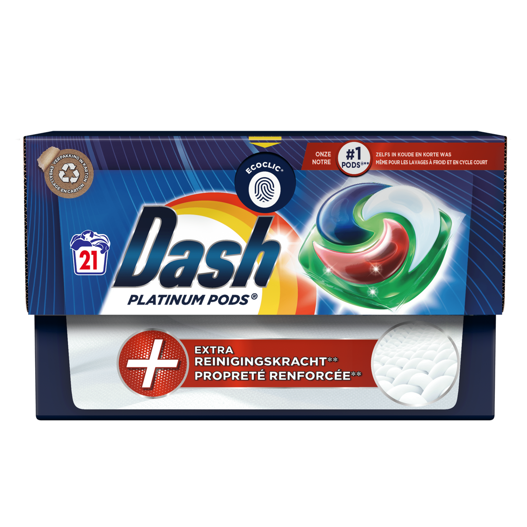 Dash Platinum PODS wascapsules plus extra vlekverwijderingskracht voor gekleurde kleding. Het is ontworpen om hardnekkige vlekken te verwijderen, zelfs bij lagere temperaturen, en biedt een onweerstaanbare frisheid.