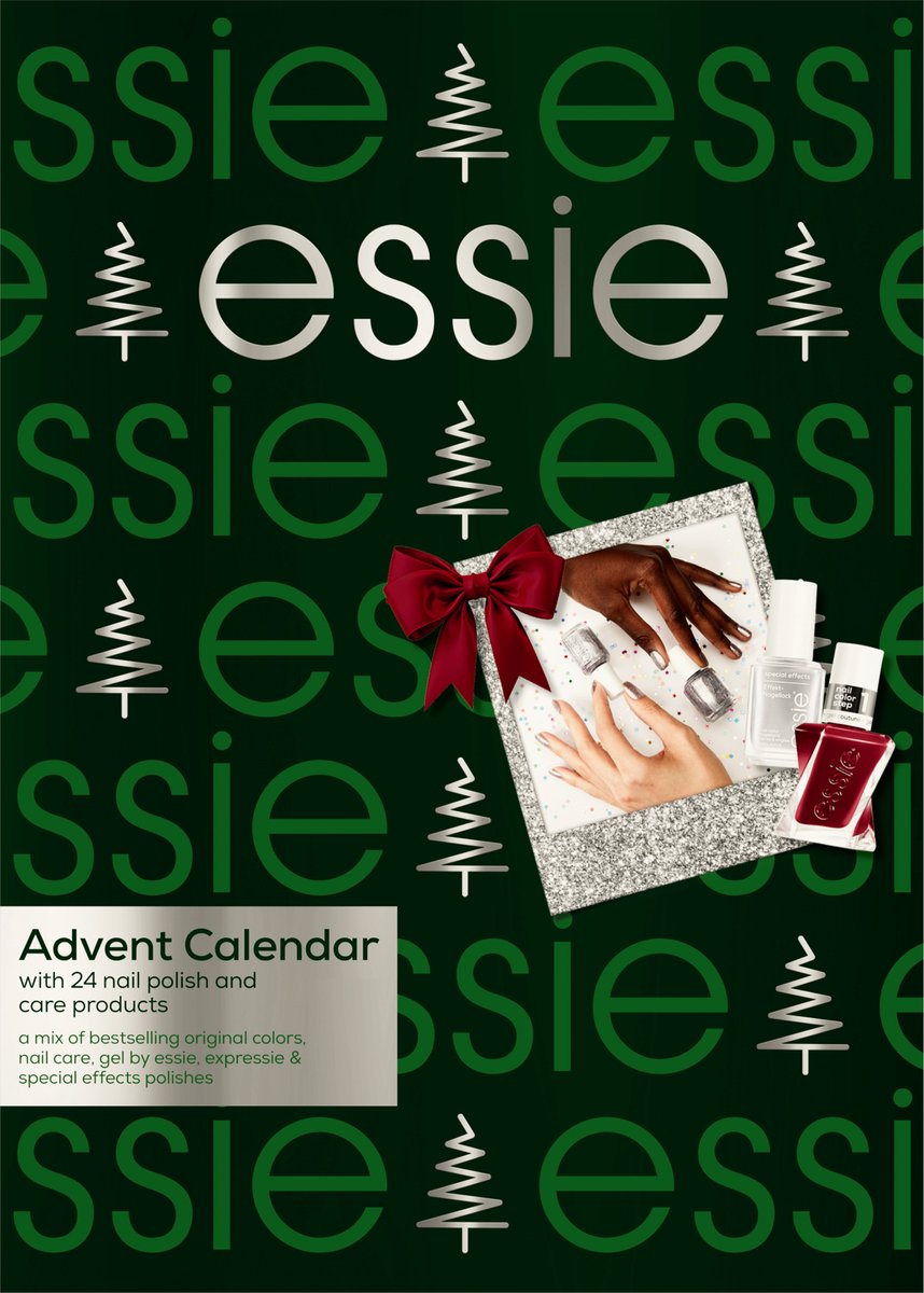 - De Essie adventskalender biedt een mix van iconische Original Colors nagellakken, sneldrogende Expressie lakken, unieke Special Effects Polishes, verzorgende Gel by Essie producten en essentiële nagelverzorgingsproducten.