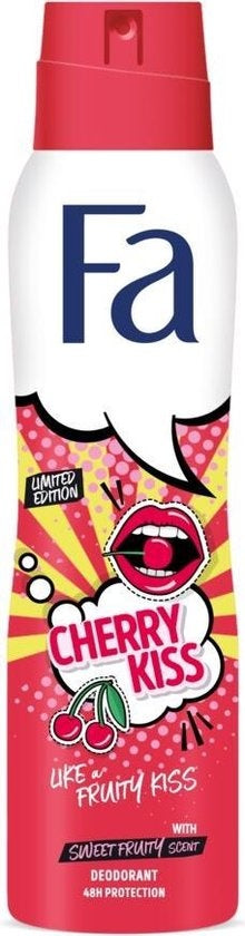 Ontdek Fa Limited Edition Cherry Kiss Deodorant spray met een heerlijk zoete en fruitige geur. De vegan formule biedt 48 uur bescherming tegen nare geurtjes en is vrij van aluminiumzouten. De verpakking bevat 25% recycled aluminium.
