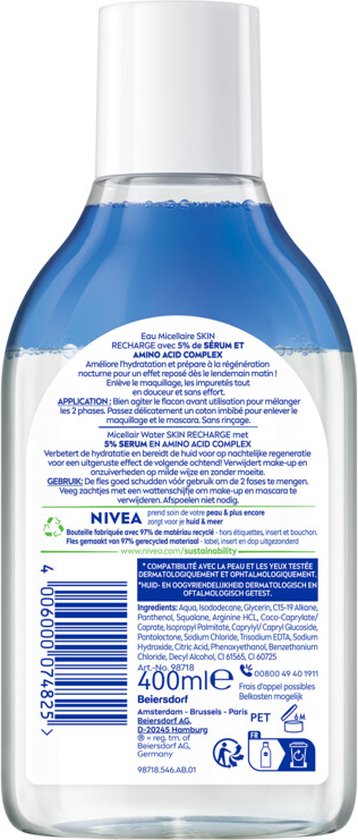 NIVEA Micellar Water Skin Recharge is een milde reiniger speciaal ontwikkeld voor de gevoelige huid. De unieke micellaire technologie verwijdert effectief make-up en onzuiverheden, zonder de huid te irriteren. De formule met Hydra IQ hydrateert de huid intens en helpt het natuurlijke vochtgehalte in balans te houden. Dit zorgt ervoor dat de huid 's nachts optimaal kan regenereren.