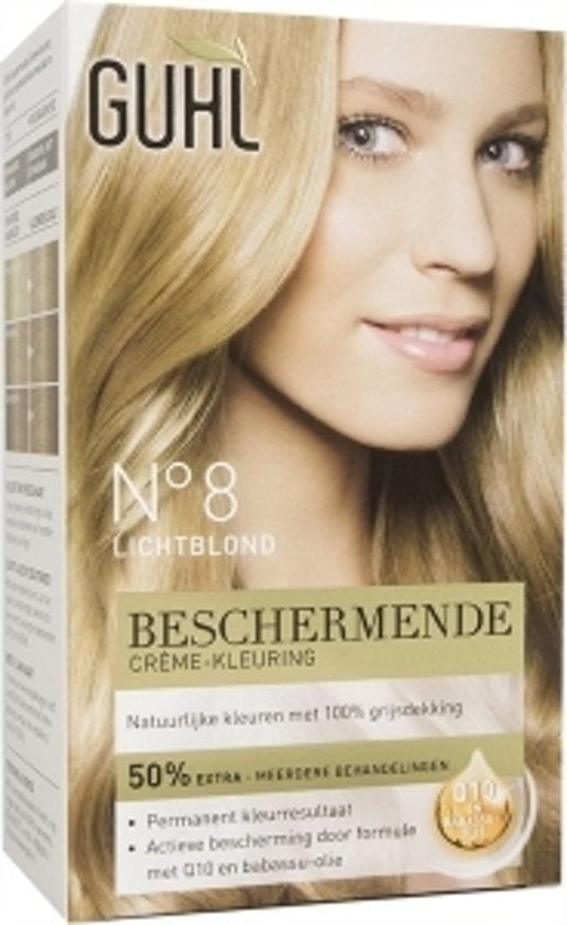 Guhl Beschermende Crème-kleuring geeft perfecte dekking aan zelfs volledig grijs haar en stelt je in staat om meerdere behandelingen met één verpakking te doen. In de kleur No. 8 Lichtblond
