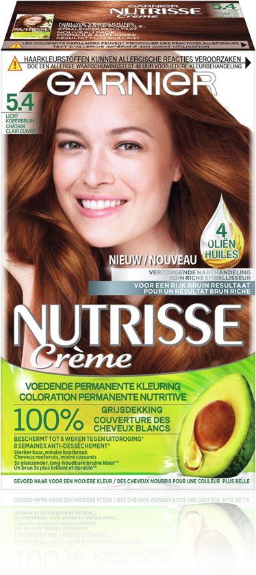 Deze vernieuwde haarkleuring van Garnier Nutrisse zorgt voor gevoed haar voor een mooiere kleur. Nutrisse voedt het haar diep tot in de wortels, beschermt tegen uitdroging en zorgt voor versterkt haar met een prachtige, glanzende kleur die lang houdt met 100% grijsdekking!