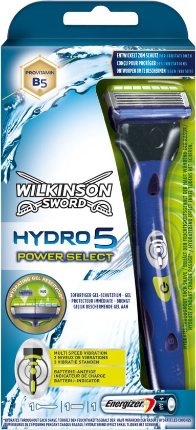 Wilkinson Hydro 5 Power Select Scheerhouder Neem controle met de nieuwe innovatieve Wilkinson Sword Hydro 5 Power Select, de ENIGE aangedreven scheerapparaat met 3 vibratie-instellingen geeft u het ultieme scheren comfort.Instellen van het scheerkracht is om huidirritatie te verminderen en met onze revolutionaire technologie Hydro je goed uitziende huid te geven. Inhoud: 1 Scheerhouder + Batterij